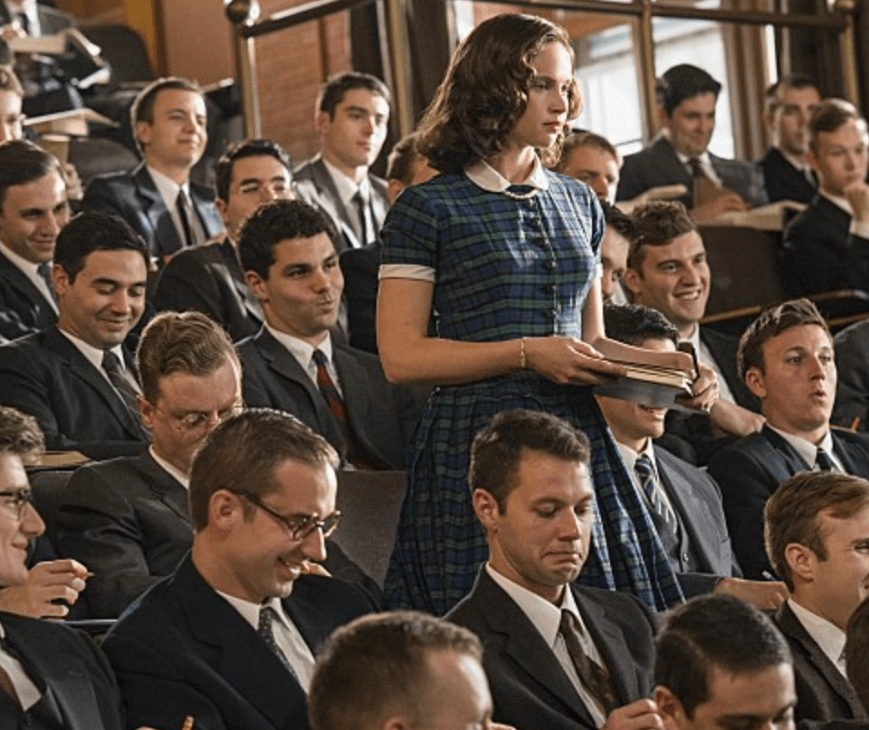 남녀 차별이 당연시되던 시대에 태어난 긴즈버그는 1950년대 하버드대학교 로스쿨에서 전체 학생 2%에 해당하는 9명의 여학생 중 한명이다. 또한 수석졸업을 하고 두 아이를 키우면서 법대 교수가 된다.