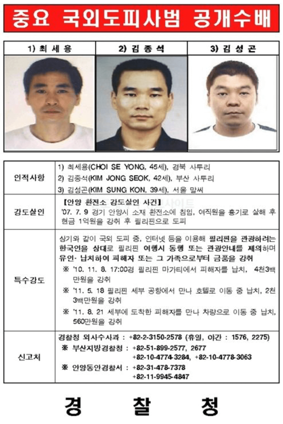 필리핀 연쇄 납치사건 최세용, 김종석, 김성곤 신상정보