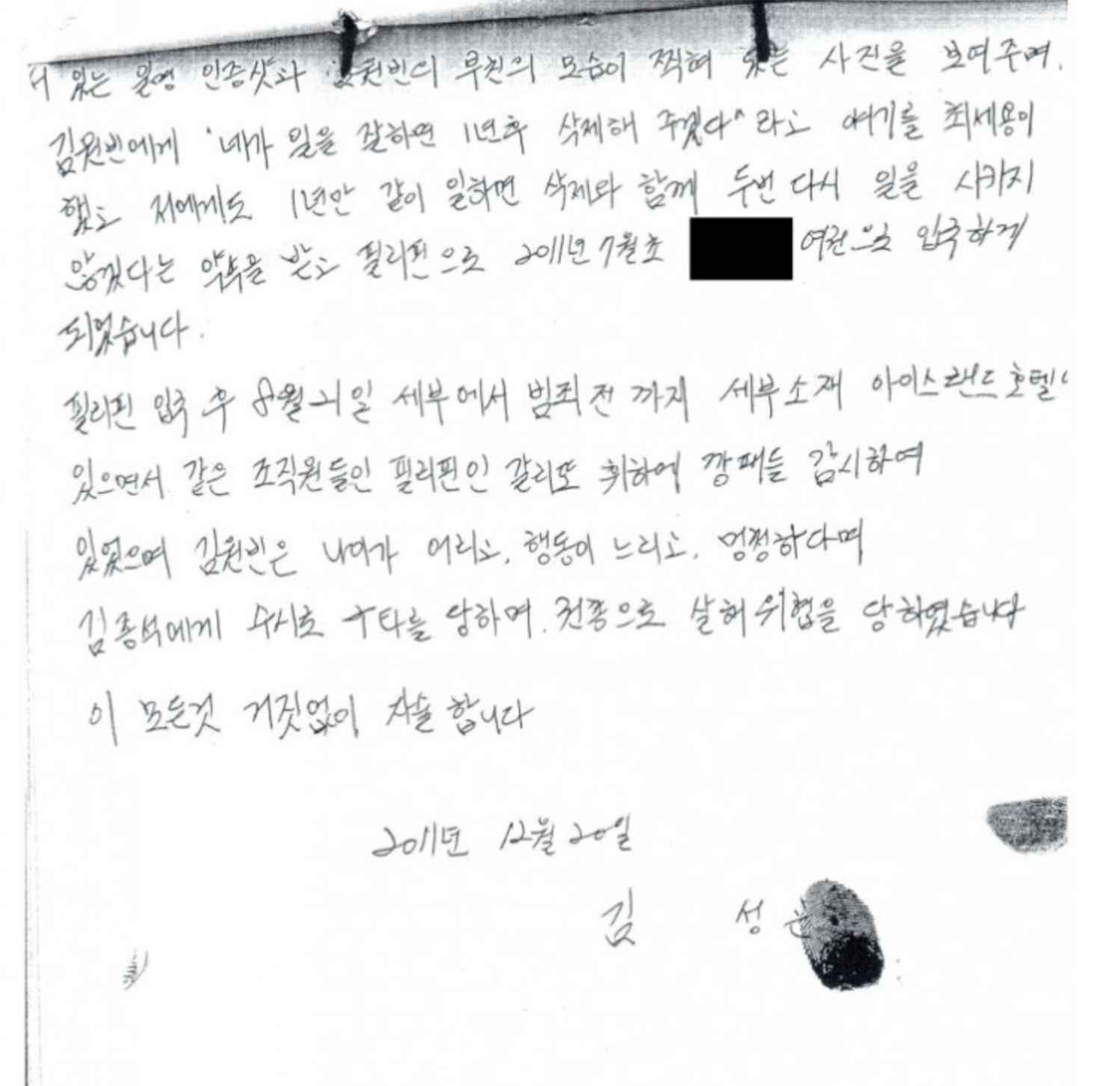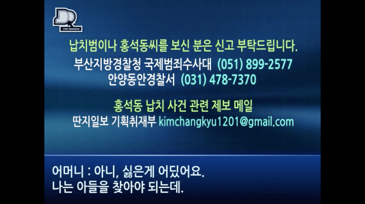5. 2011년 11월 김종석이 홍석동 가족과 윤천완 가족 측에 전화해 금품 요구. 홍석동이 죽었다고 협박하고 유골을 받고 싶으면 돈을 더 내라고 협박