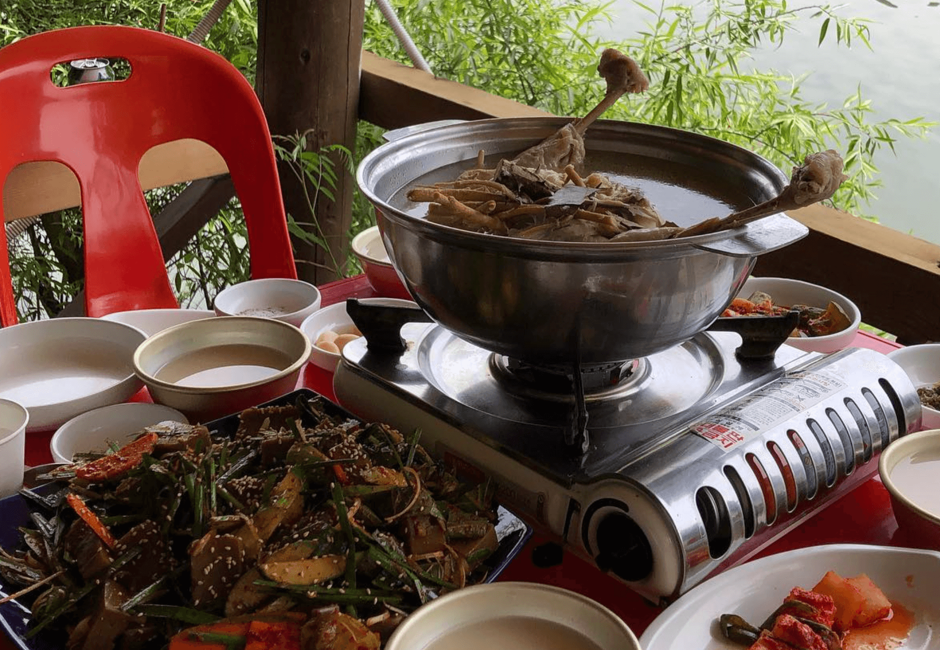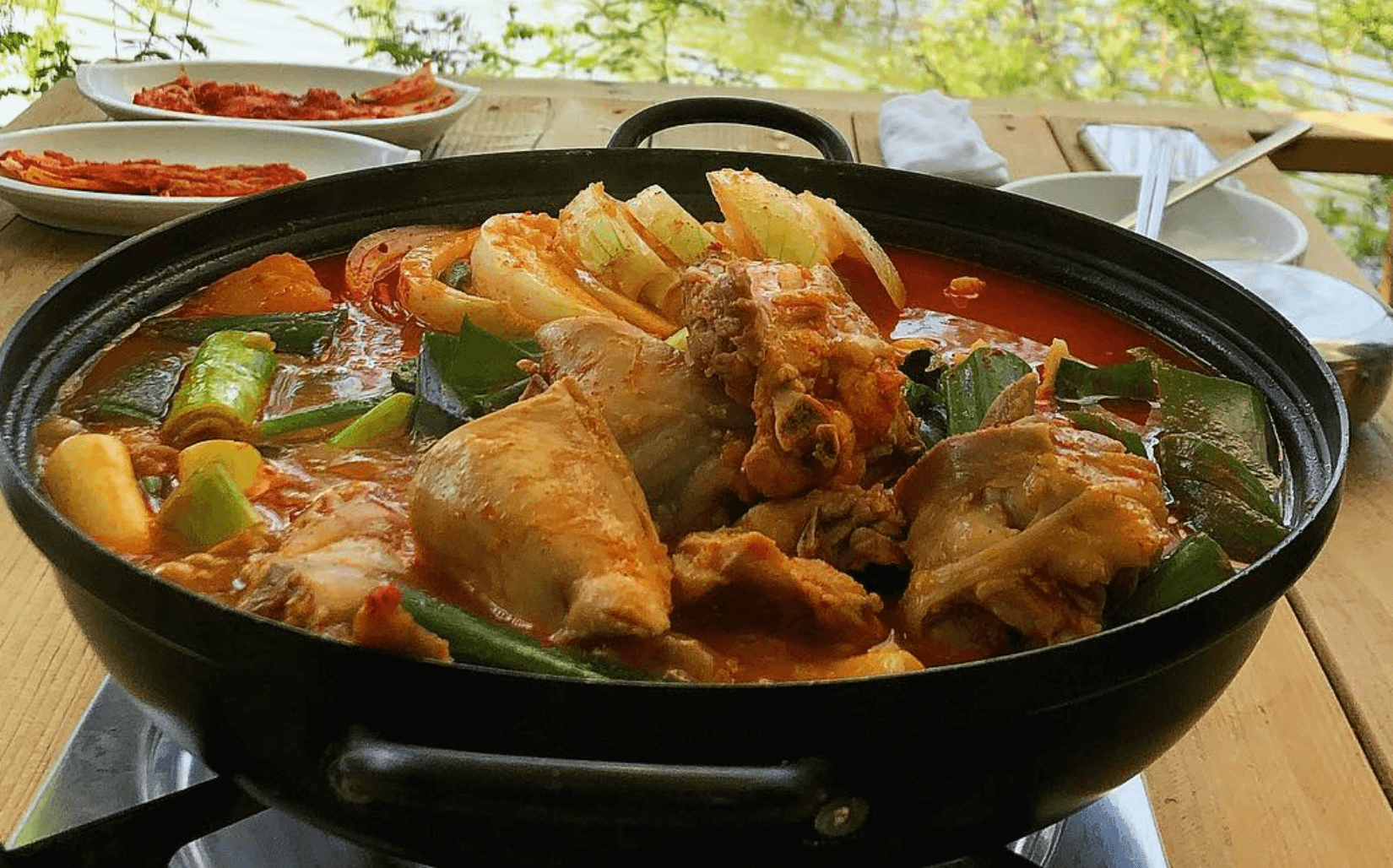 여름에 먹기엔 야외라 조금 덥지만 닭을 좋은 거 쓰시는 거 같아요 부드럽고 살이 잘 발라져요 닭볶음탕은 볶음밥 해드시고용 닭백숙은 죽 해드세용